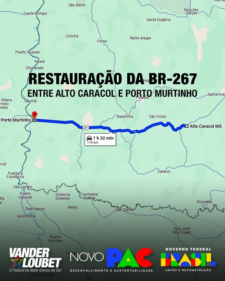 Ainda segundo o parlamentar, a restauração desse trecho da BR-267 é uma parte importante do projeto da Rota Bioceânica. “Obra importantíssima para preparar nossa infraestrutura rodoviária para a Rota Bioceânica, afinal, estamos falando da rodovia que levará os motoristas até a ponte sobre o Rio Paraguai, que vai ligar Murtinho à cidade paraguaia de Carmelo Peralta”, concluiu.