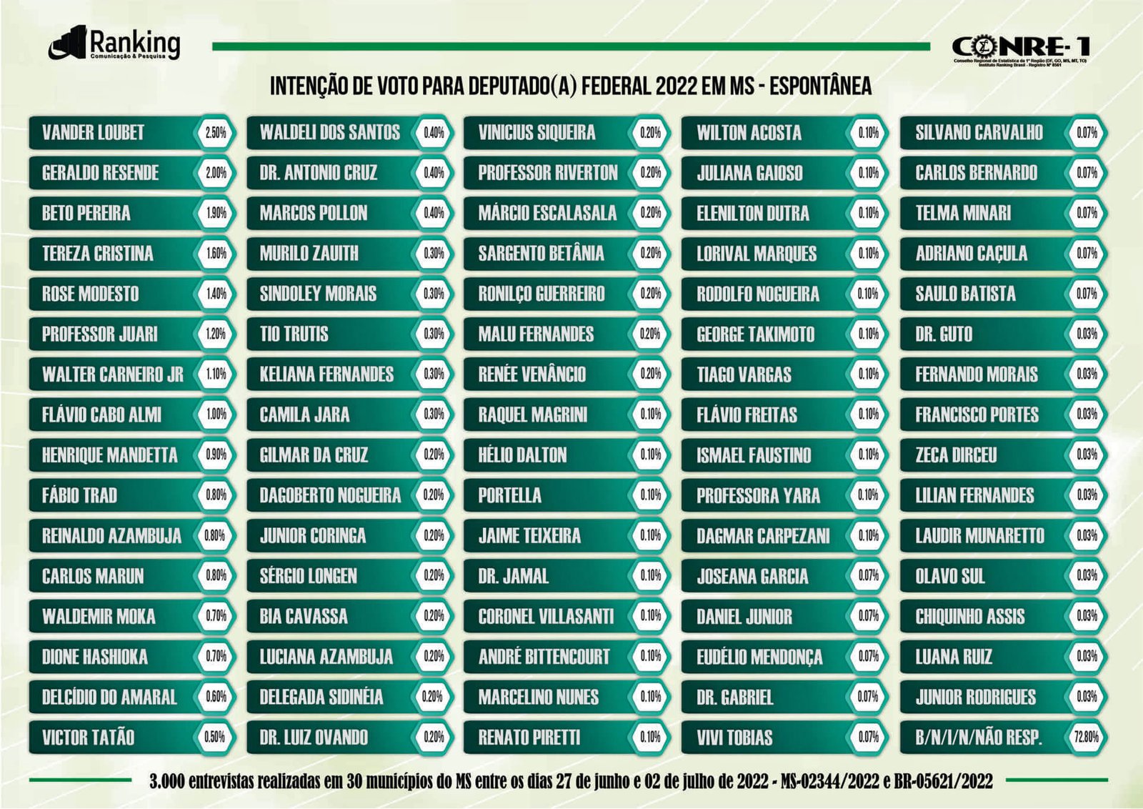 Vander Loubet foi eleito deputado federal pela primeira vez em 2002 e sempre esteve entre os mais votados. Além de projetos e recursos que viabilizou para Mato Grosso do Sul – com significativos aportes financeiros que garantiram investimentos em infraestrutura urbana e rural, saúde, saneamento básico, educação, segurança pública e agricultura familiar – o parlamentar tem sido uma peça fundamental na engrenagem e na dinâmica que embala o desenvolvimento de Campo Grande e de todo o Mato Grosso do Sul, o que pode ajudar a explicar sua primeira colocação na pesquisa Ranking.