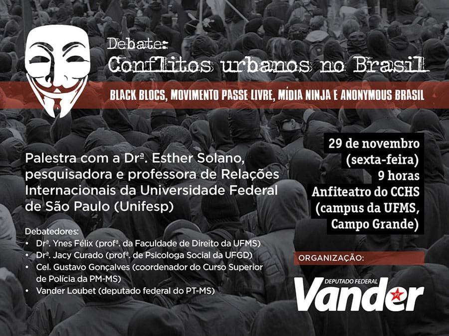 O mandato do deputado federal Vander Loubet está organizando o debate “Conflitos urbanos no Brasil – Black Blocs, Movimento Passe Livre, Mídia Ninja e Anonymous Brasil”. Será nesta sexta-feira, 29 de novembro, a partir das 9 horas, no Anfiteatro do CCHS, no campus da UFMS em Campo Grande.