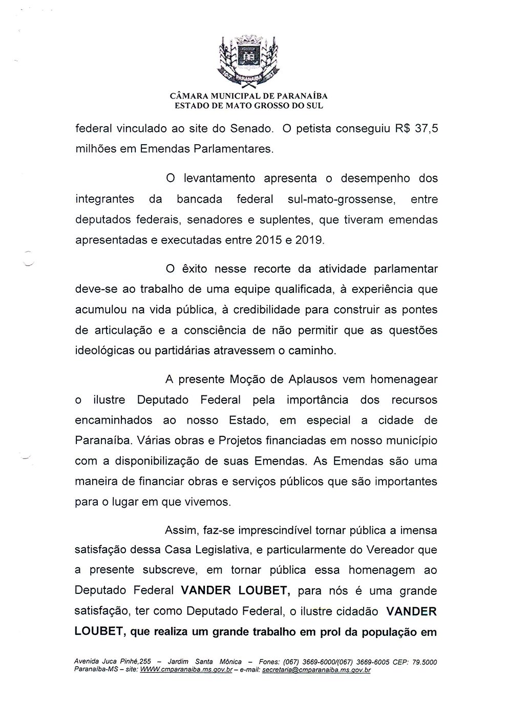 No primeiro documento, Robalinho parabenizou Vander por ser o congressista sul-mato-grossense que mais emendas parlamentares viabilizou nos últimos cinco anos. Essa informação faz parte de um levantamento realizado a partir de dados do Siga Brasil, portal do Senado Federal que acompanha a execução do orçamento federal.