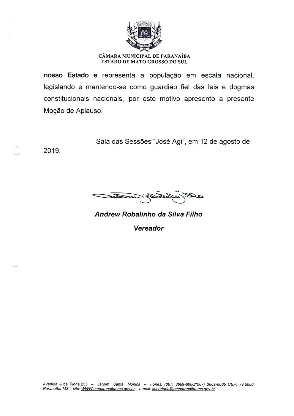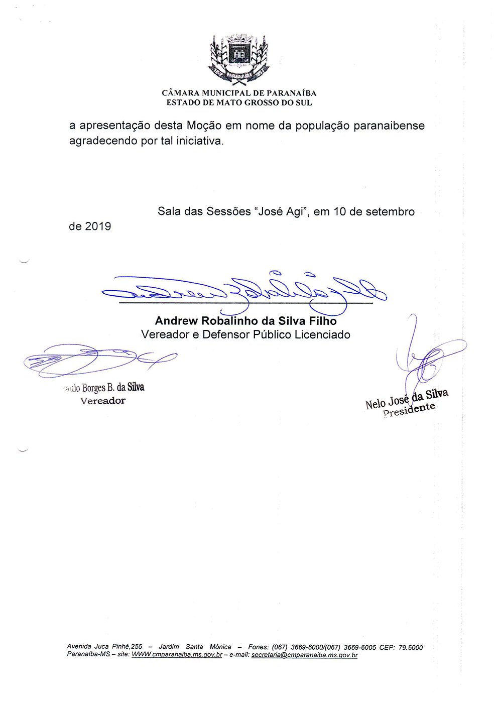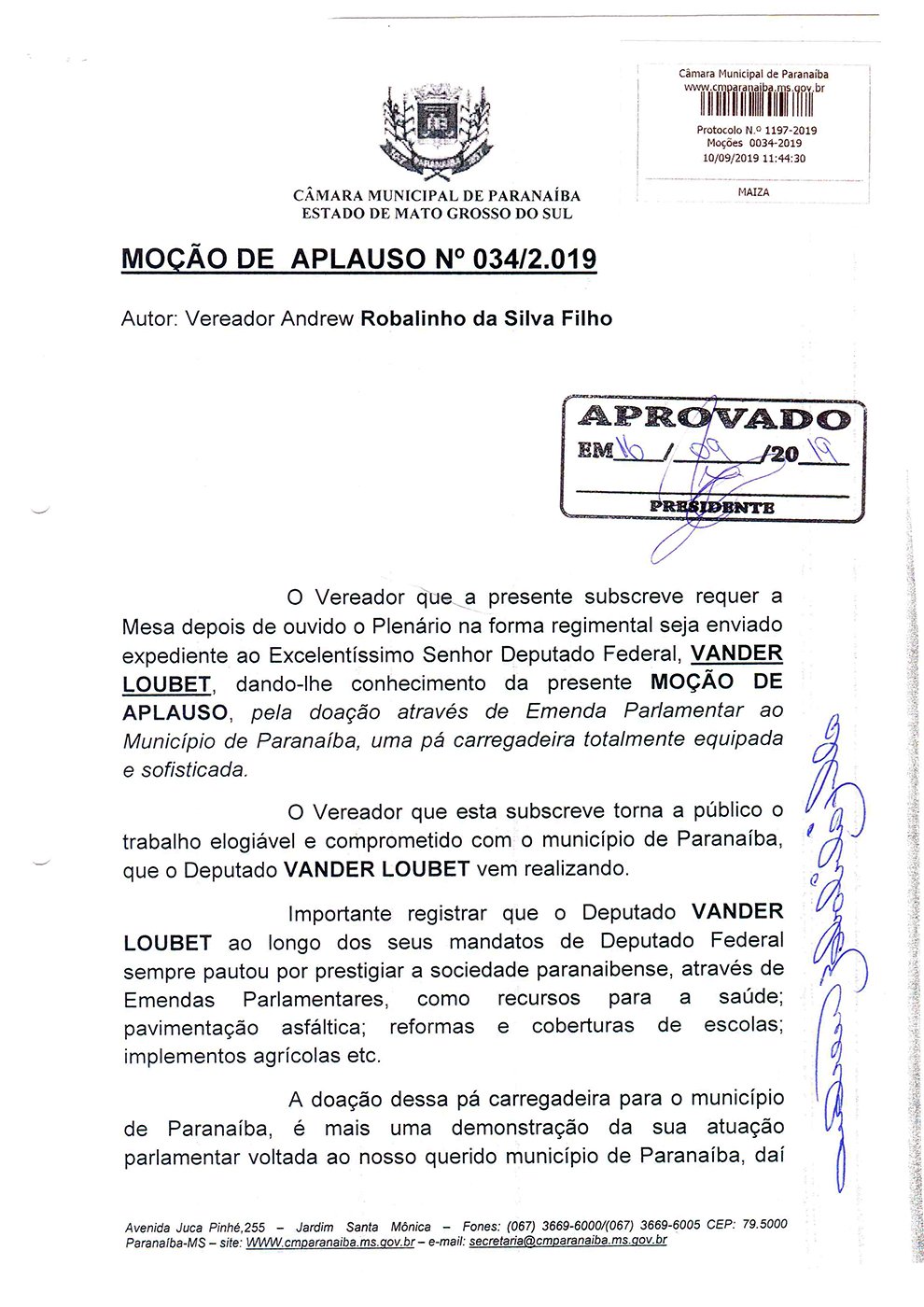 A Câmara Municipal de Paranaíba enviou recentemente ao gabinete do deputado federal Vander Loubet, em Brasília, duas moções de aplauso de autoria do vereador Andrew Robalinho.